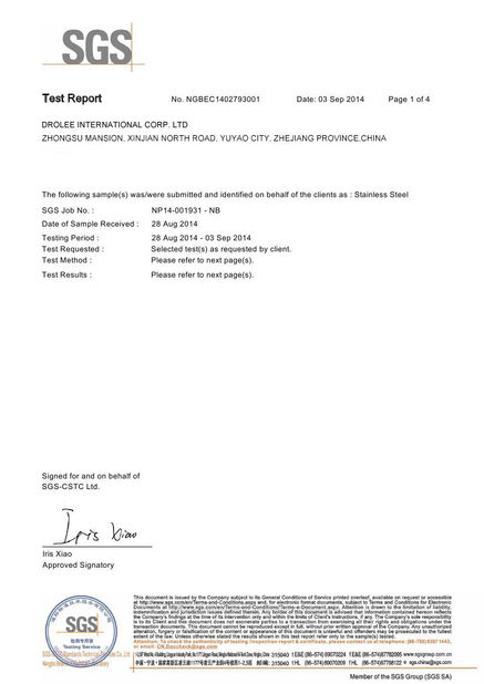 Standard:SGS Report - SUS410 Issue Date:2014-08-25 Scope/Range:STAINLESS 410 SCREW Issued By:SGS |